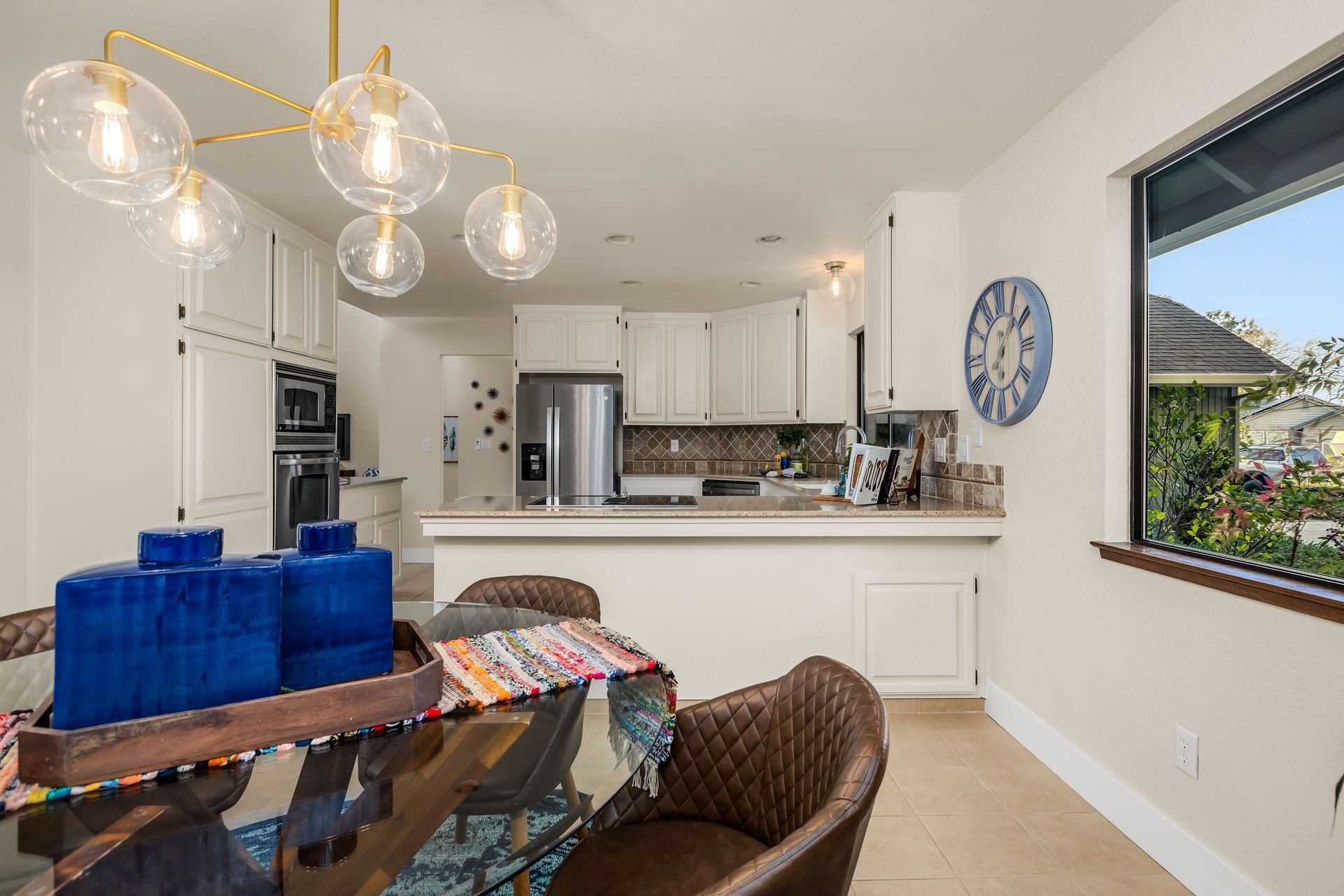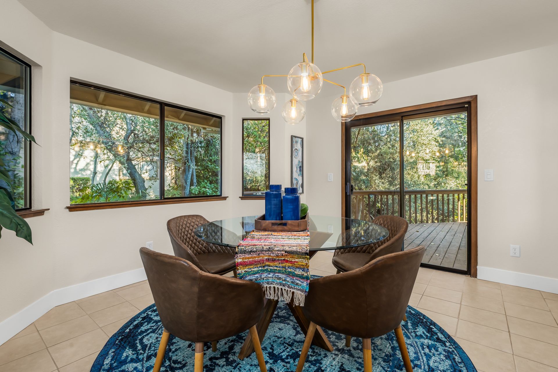 - Dining nook with bay window, sliding door to the deck, and new chandelier