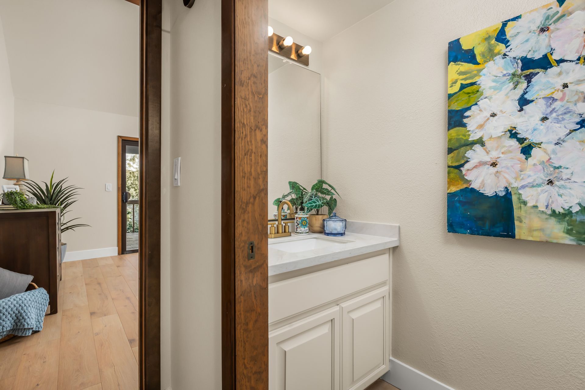 - Main-floor half bath with new quartz countertops and faucet