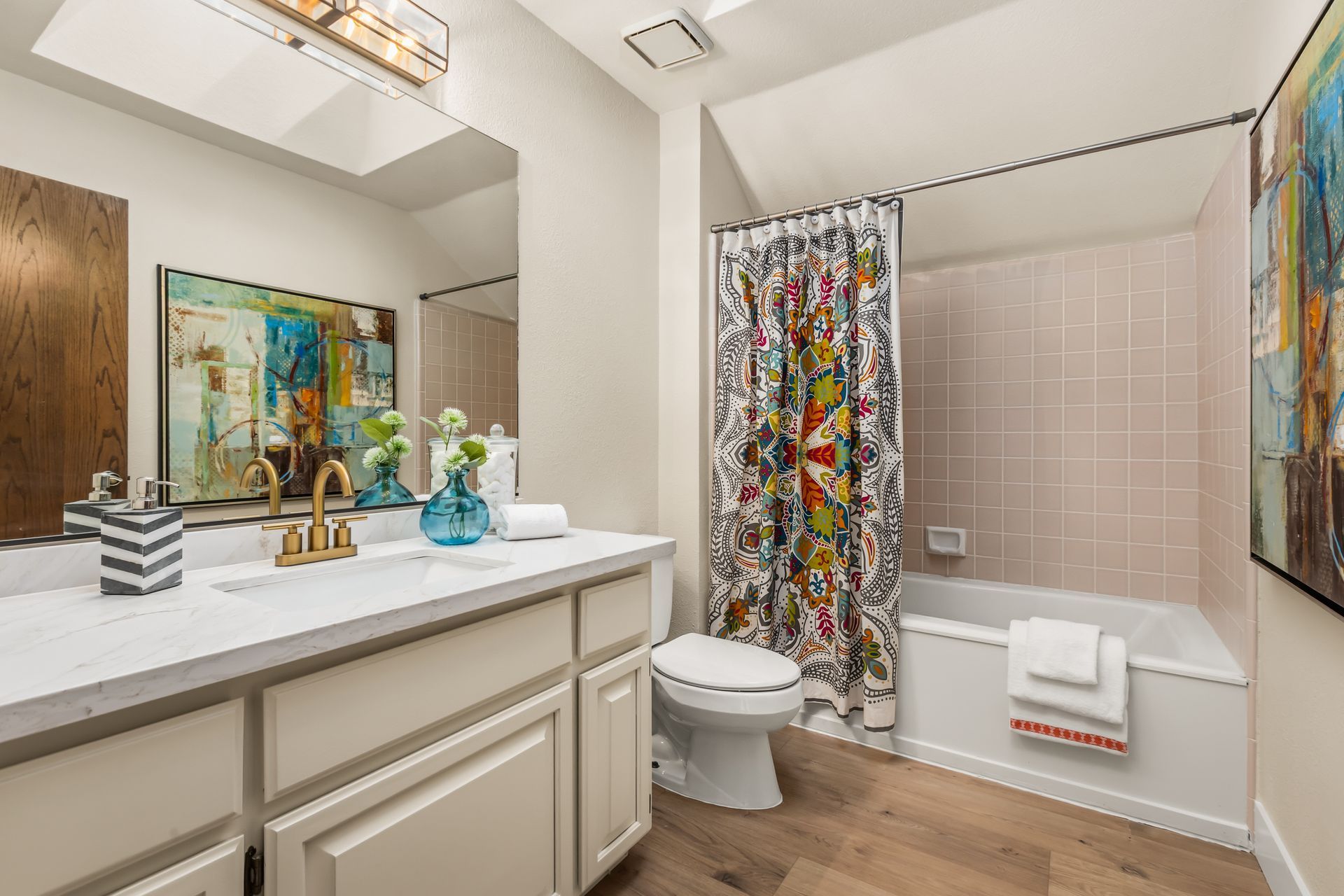 - Hall bath with skylight and new quartz countertops and faucet