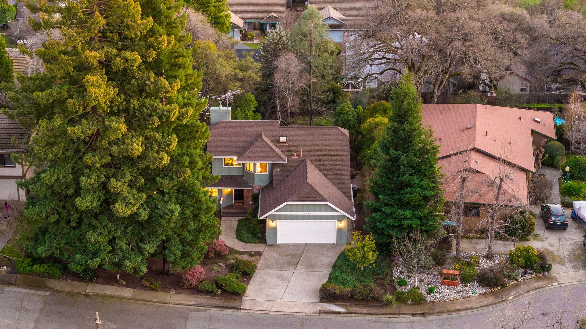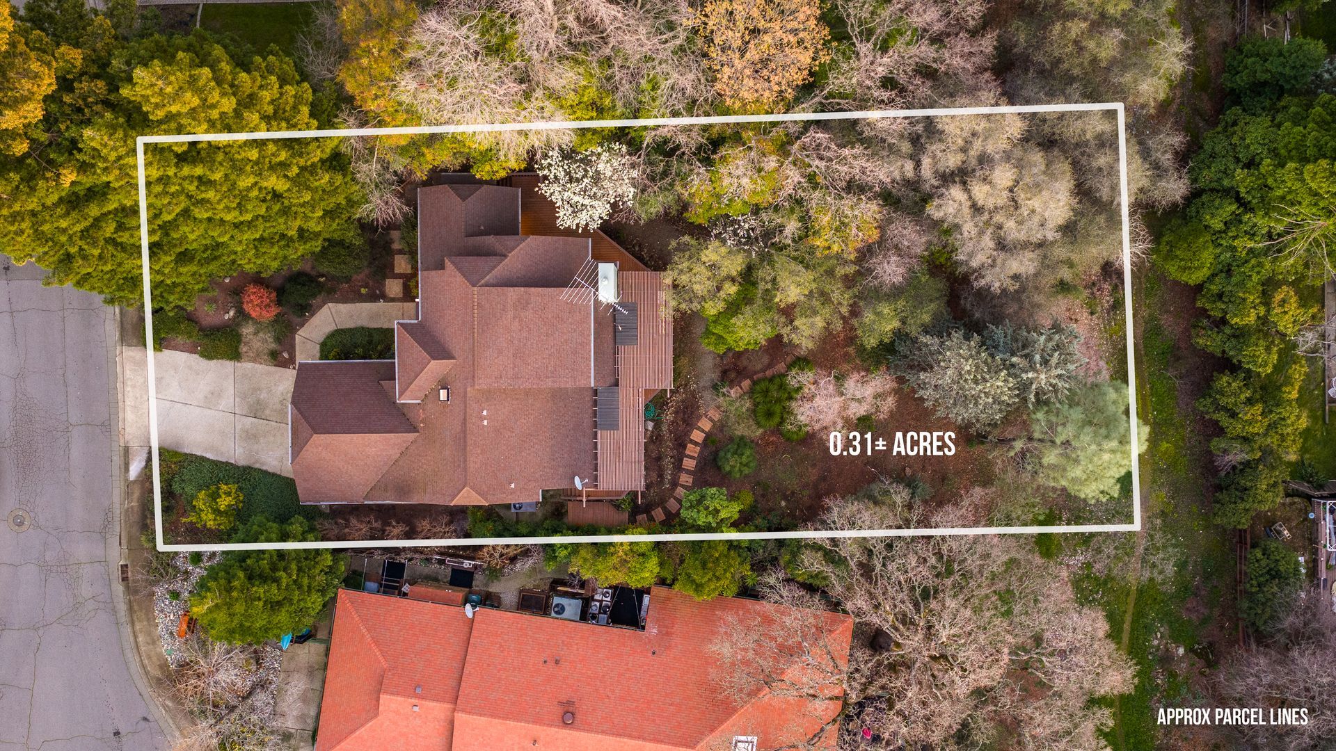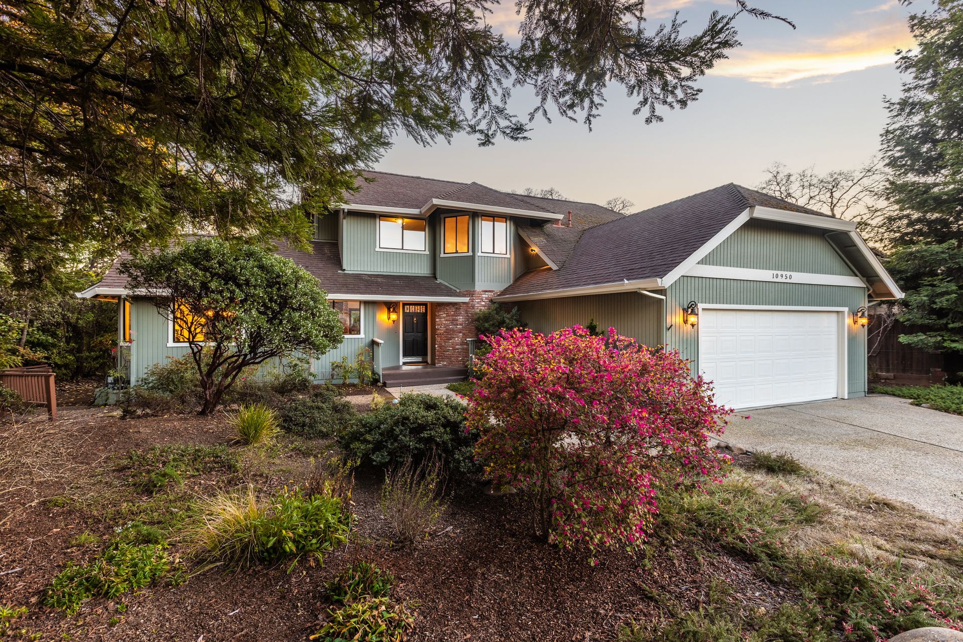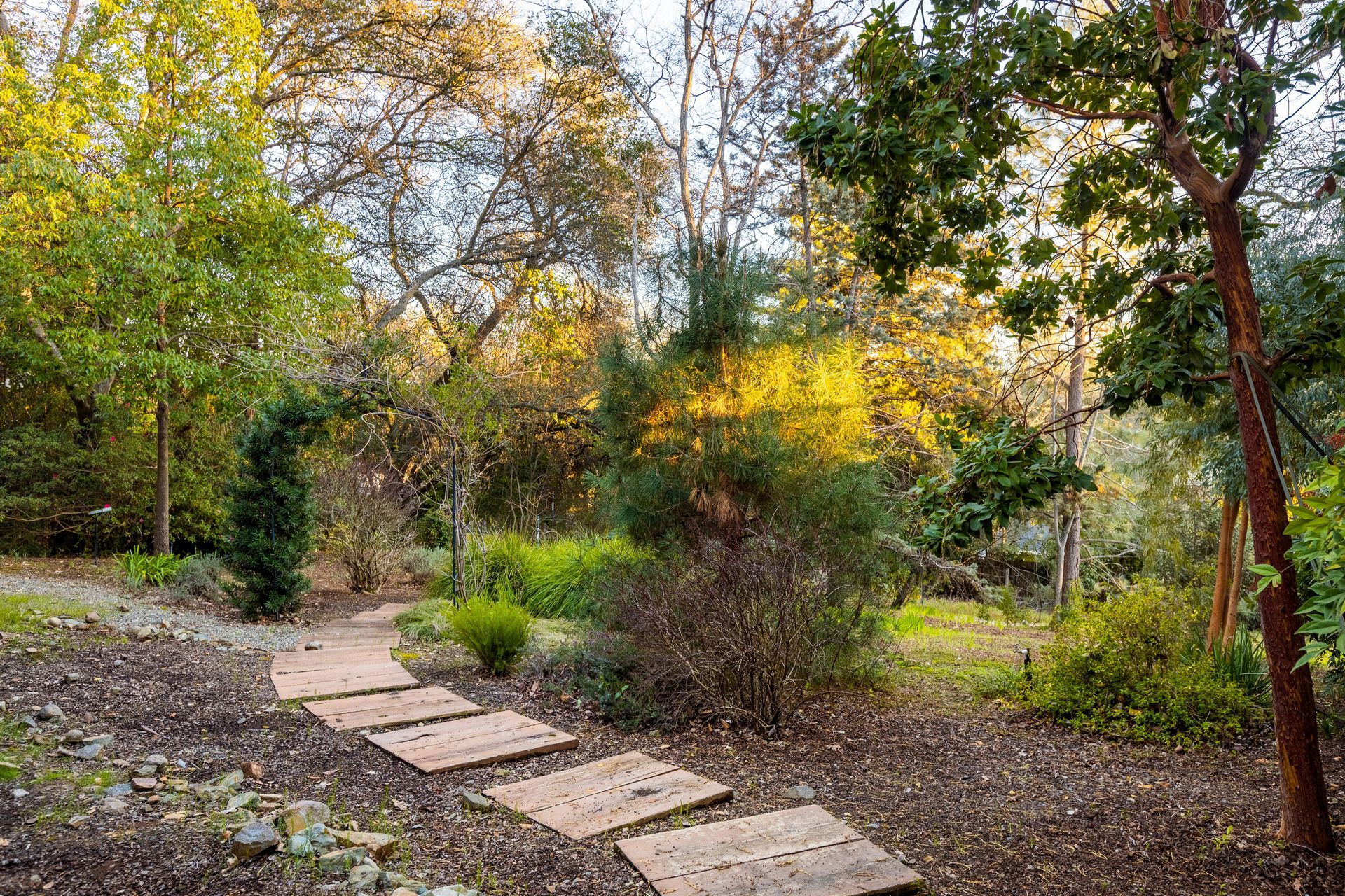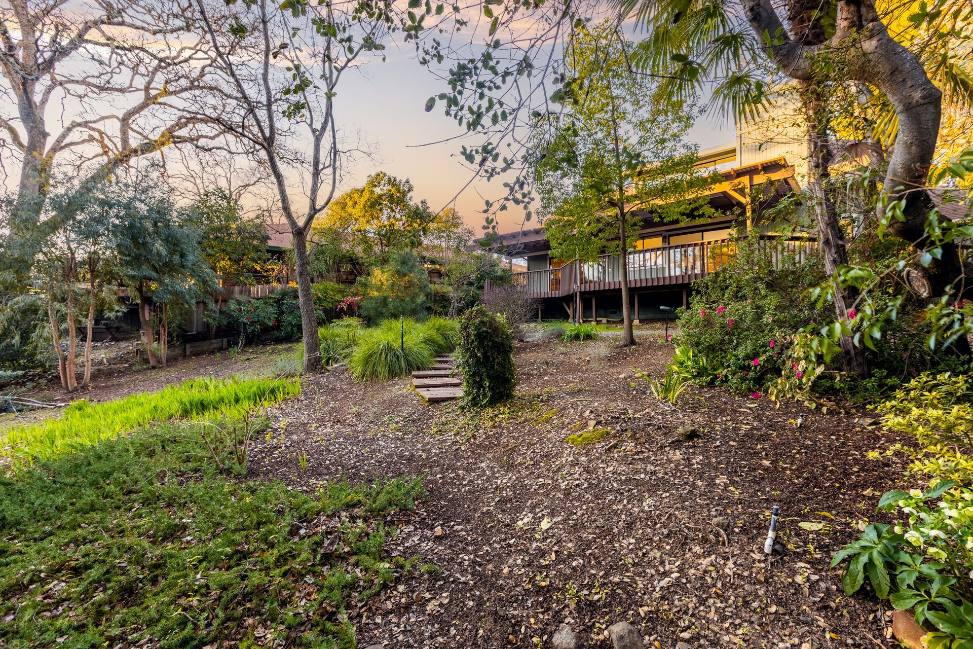 - Mature trees, shrubs, and garden paths
