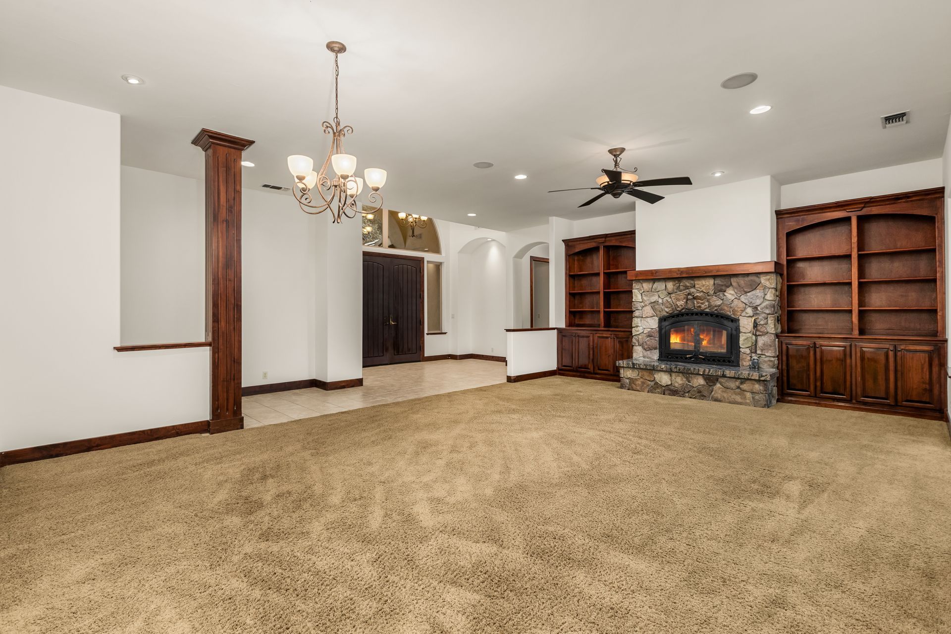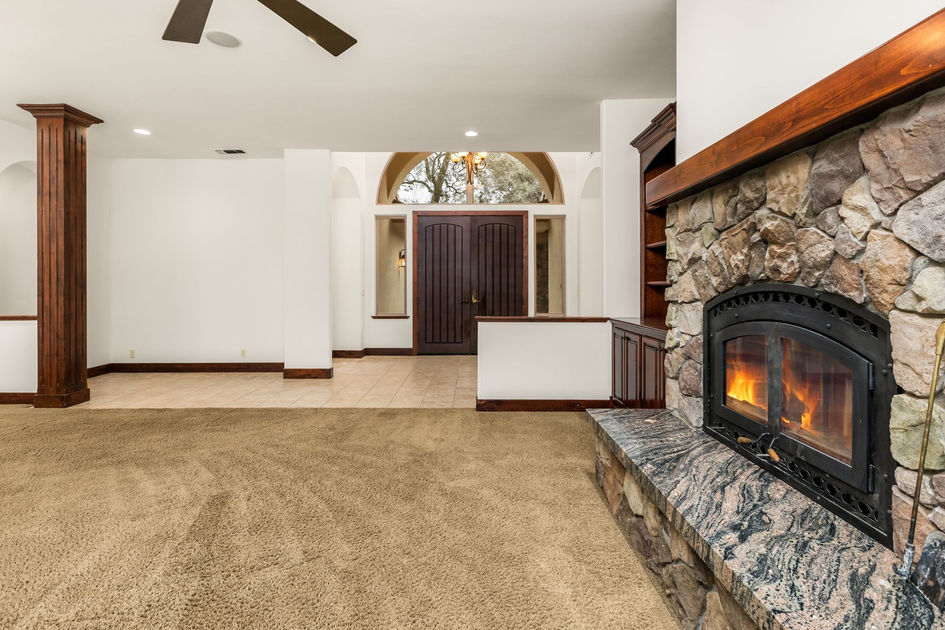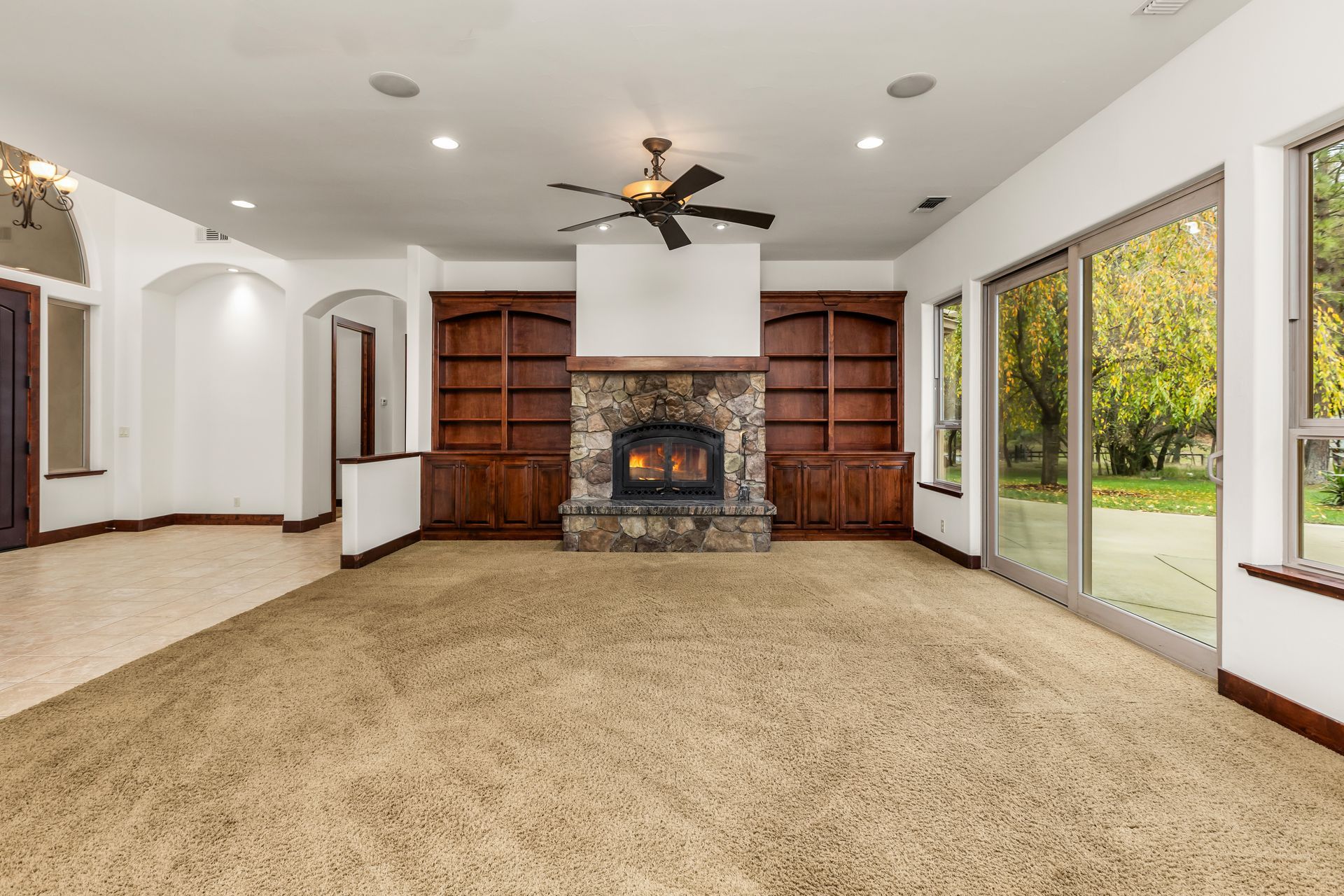 - Lennox Zero Clearance wood-burning fireplace with rock surround and granite hearth flanked by built-in bookcases and cabinetry