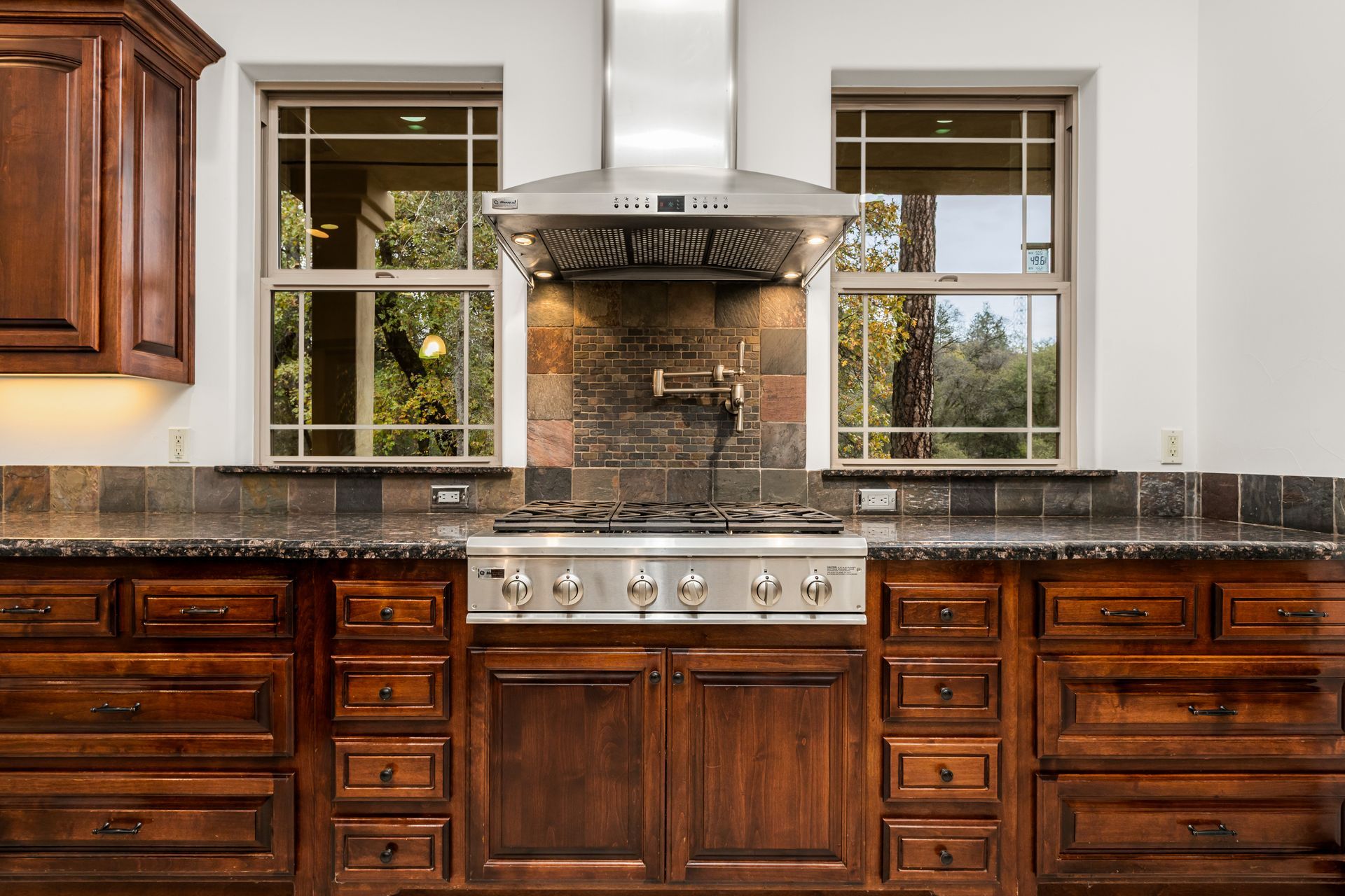 - GE Monogram 6-burner gas cooktop and hood, pot filler, decorative slate backsplash