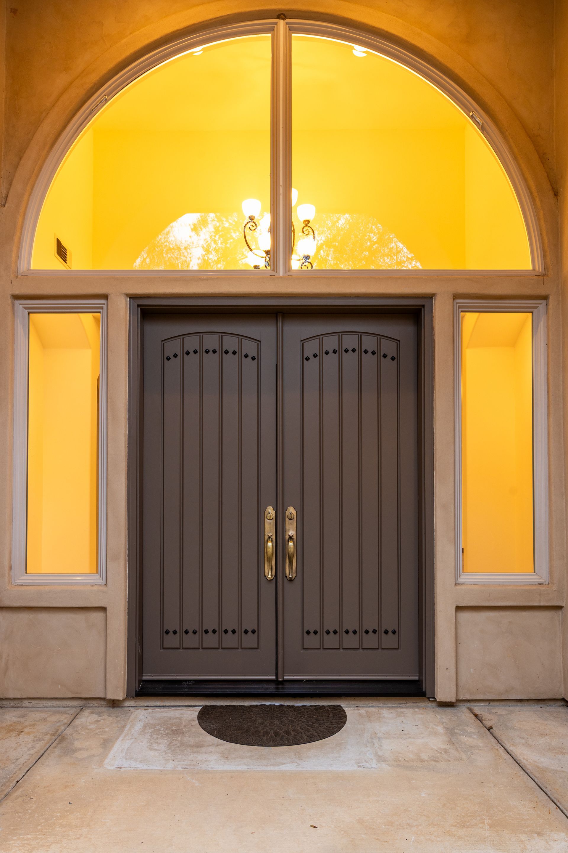 - Double-sided wood front door with glass flanking windows and arched transom window