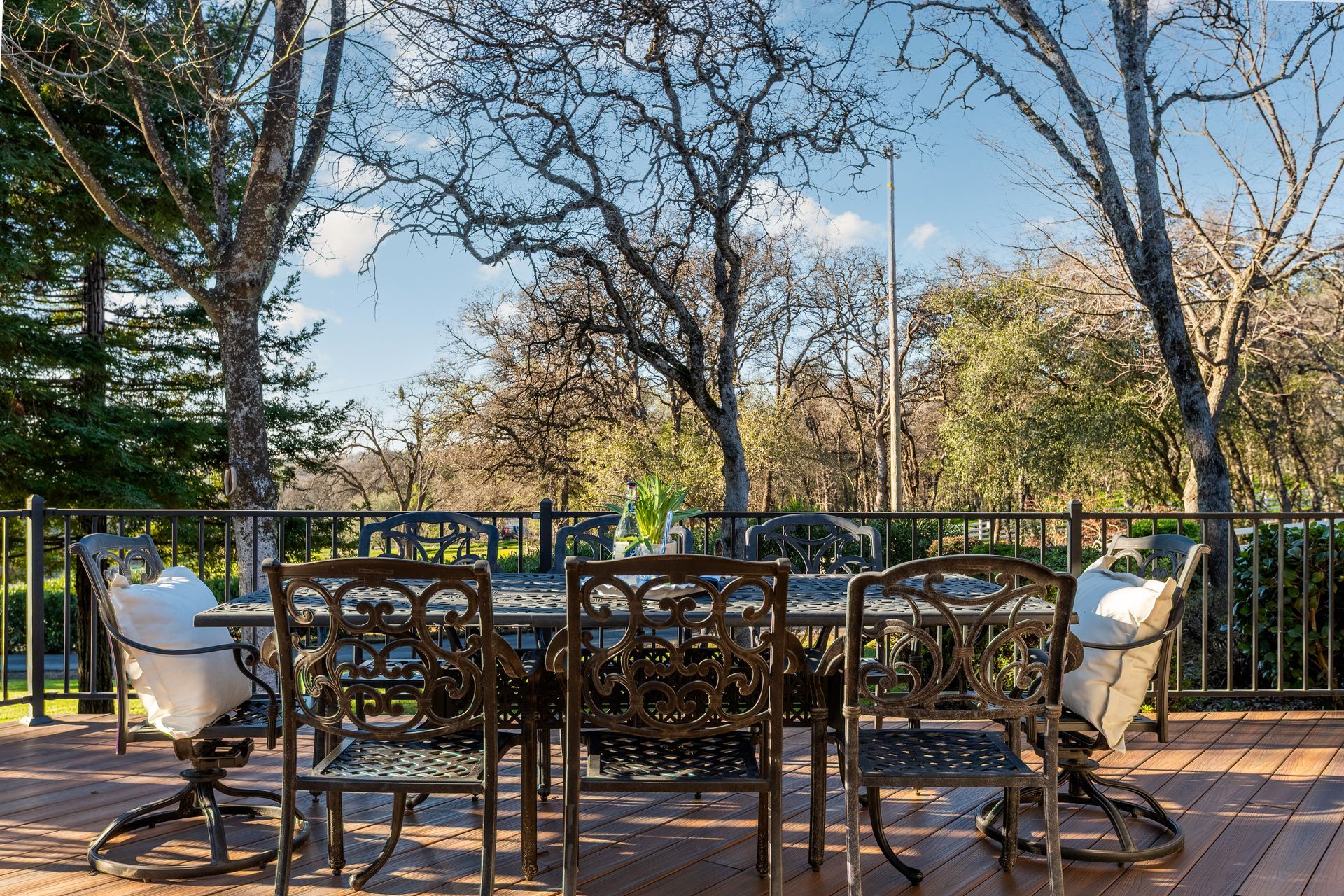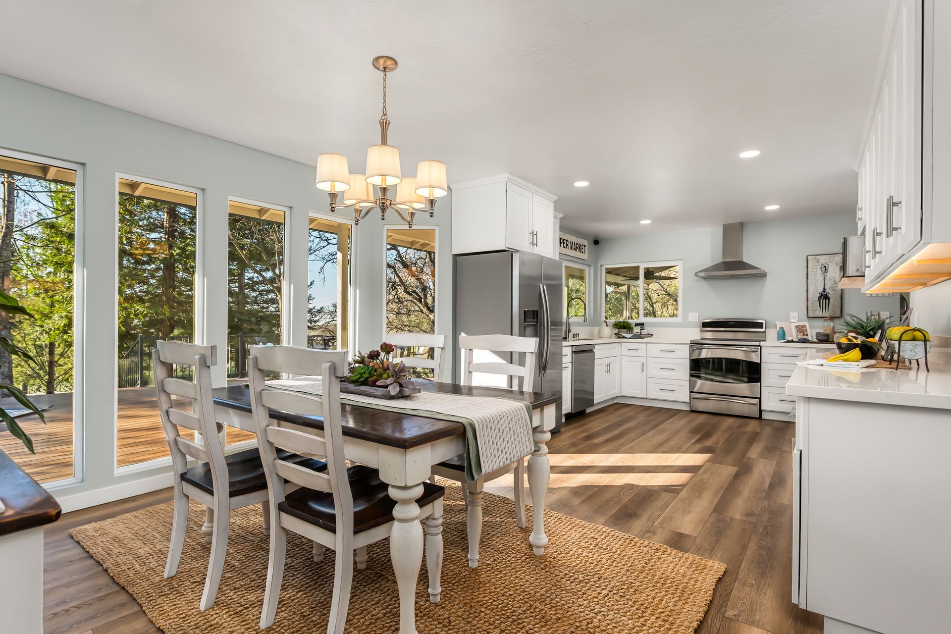 - Bay-style eating area overlooking the deck, future pool area, and pasture