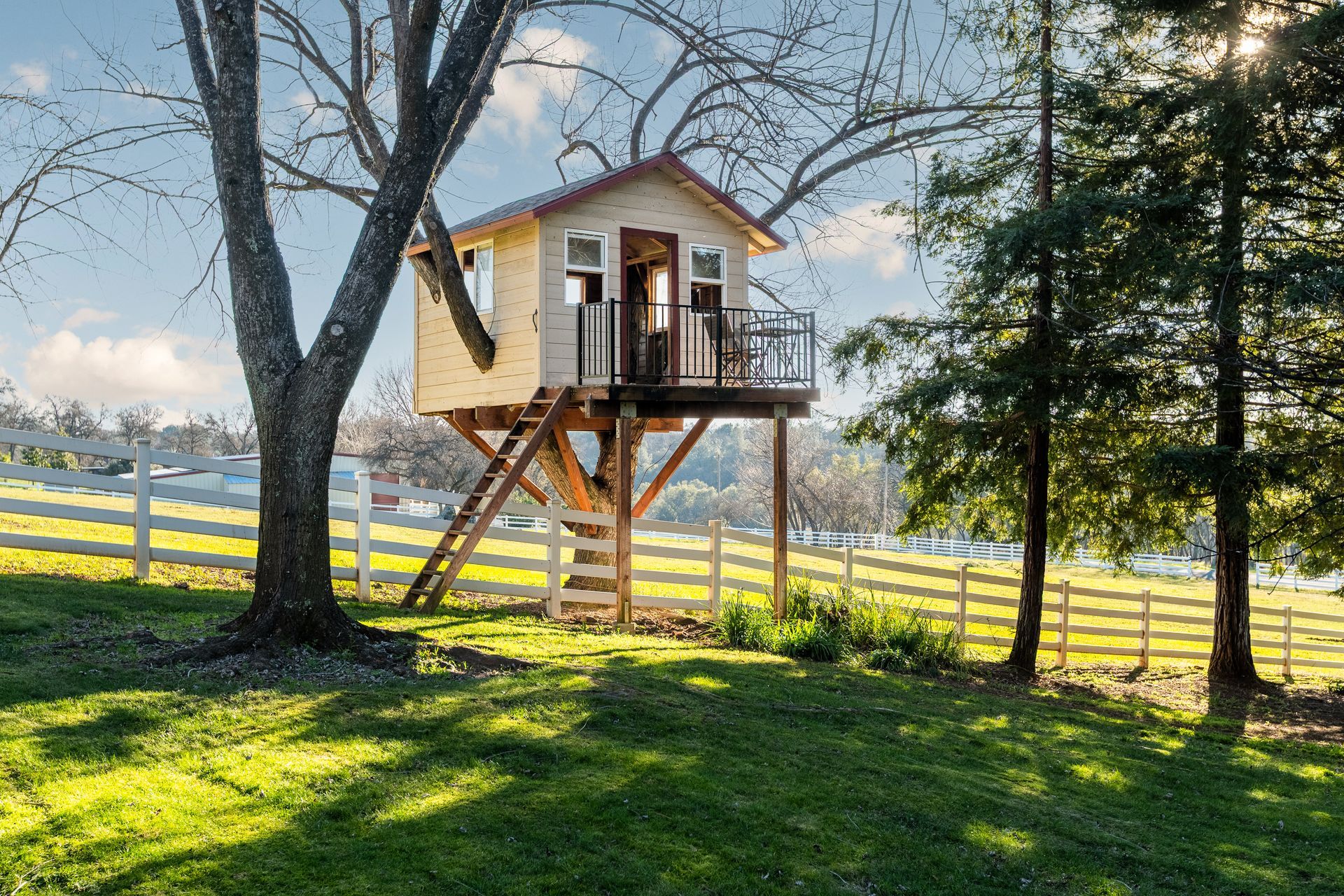 Step outside to enjoy sunset views and seamless outdoor living from the expansive 1,000 sq ft composite deck with metal railing, which extends down to the lawn or a future pool site. Kids will love the 100 sq ft treehouse, while the two-stall horse barn, currently utilized as a chicken coop, offers flexible use for animals or storage. Of the 4 acres, approximately one acre is fully landscaped and irrigated, while the remaining acreage includes a four-rail fenced pasture and a large cleared, graded pad with hook ups—ideal for RV parking, a future ADU, shop, barn, or equestrian facilities. Every element—from the peaceful setting to the thoughtful improvements—has been designed to support a relaxed, intentional foothill lifestyle.
