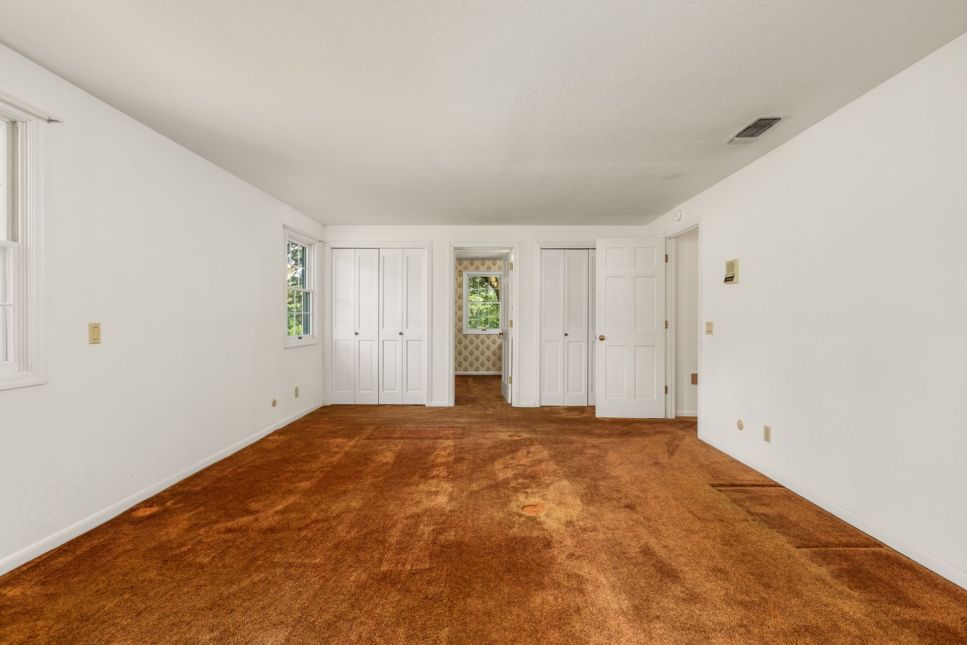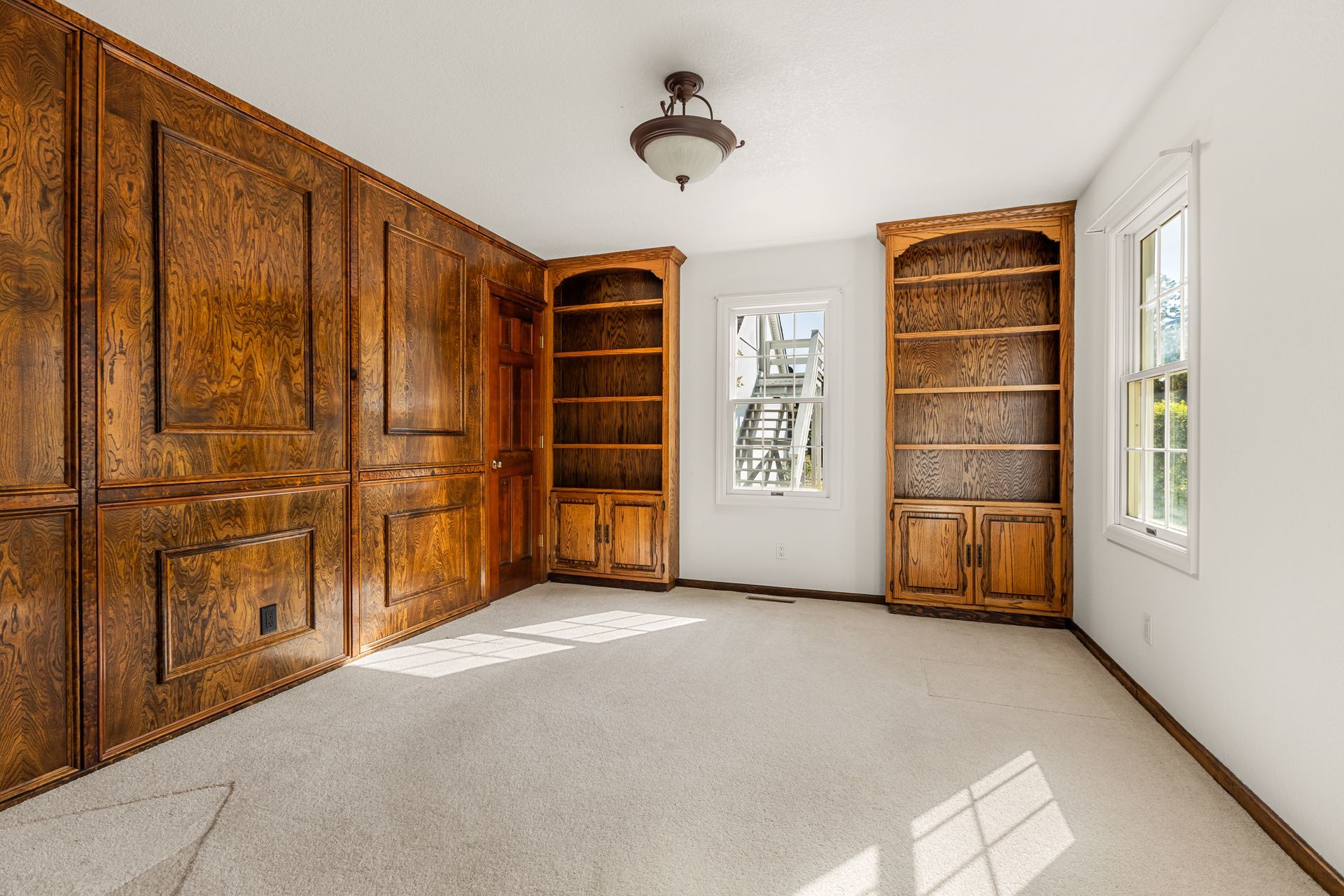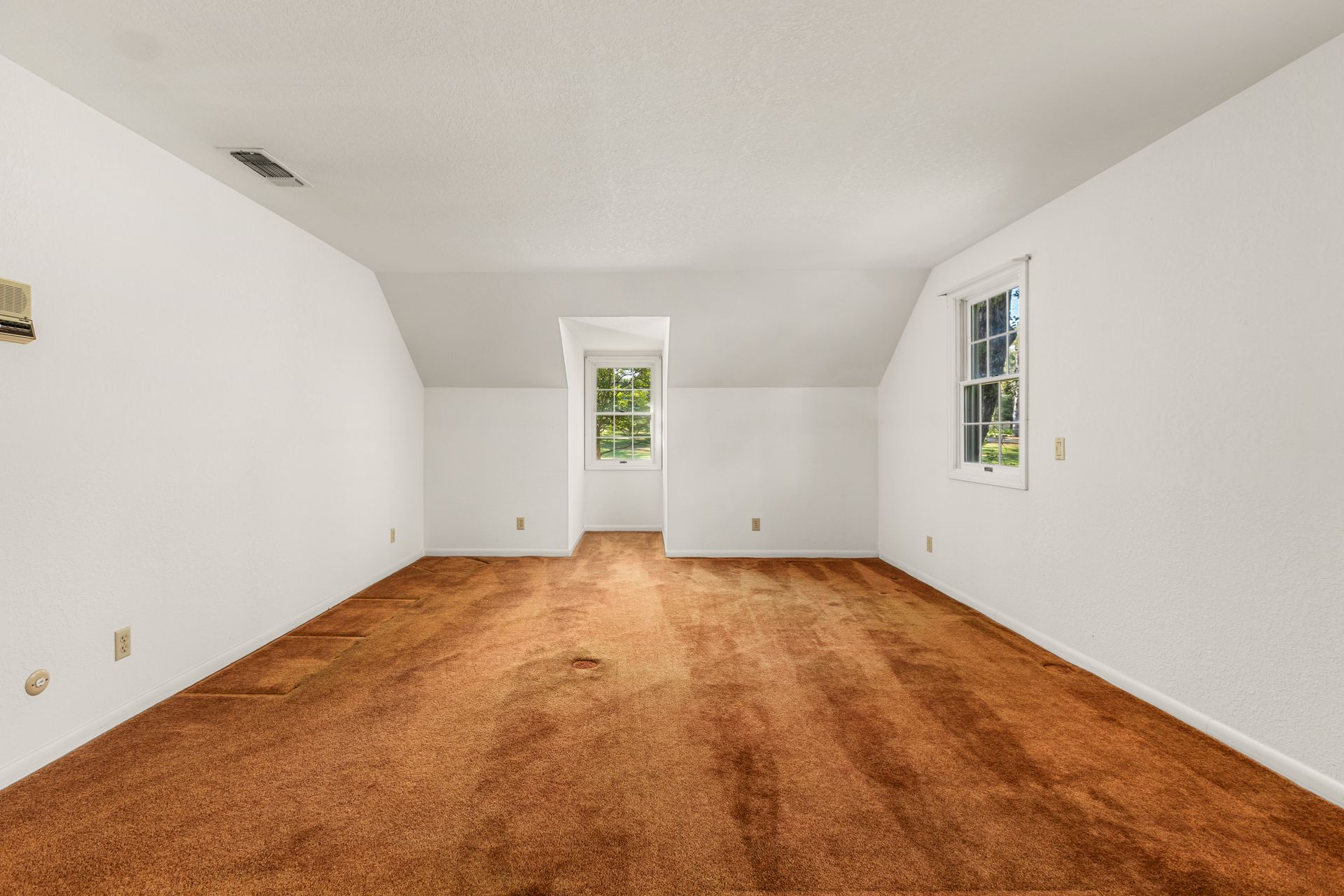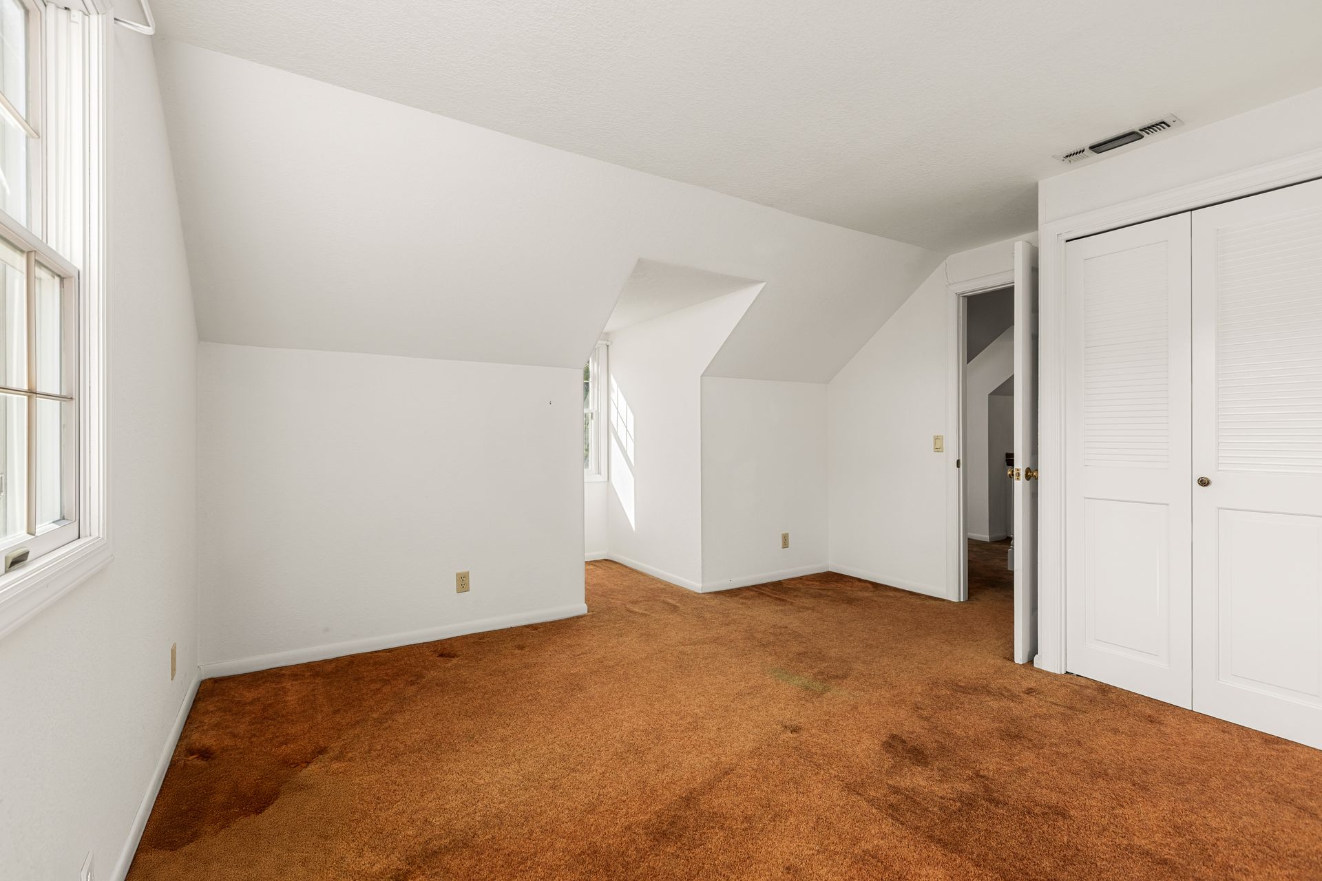 Inside, you’ll find a warm and inviting ambiance with charming details throughout—from refinished hardwood floors, fresh paint, crown molding, arched room transitions and cozy wood-burning stoves. The flexible downstairs bedroom is ideal as an office or guest suite, sitting beside a full bath. Upstairs, the home offers three bedrooms, including a spacious primary suite with dormer windows and three closets. Unique to this property is the unfinished storage space accessed via an exterior composite staircase—featuring a window and power already in place; making for a great future office or studio.
