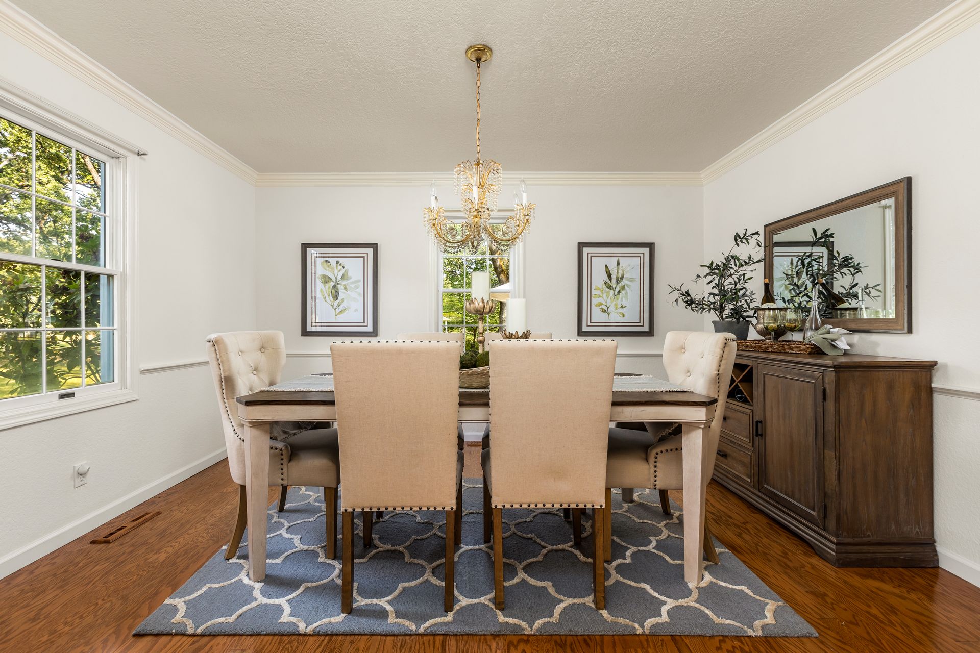 The expansive backyard patio is ideal for gatherings—framed by majestic oaks and a meticulously maintained lawn. This home blends beauty and practicality at every turn.