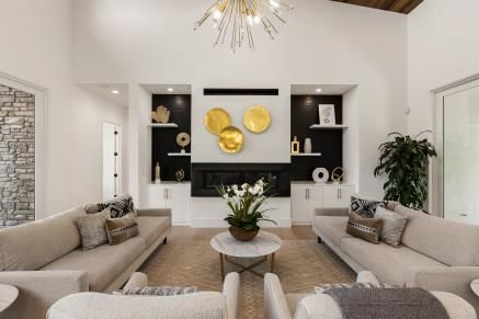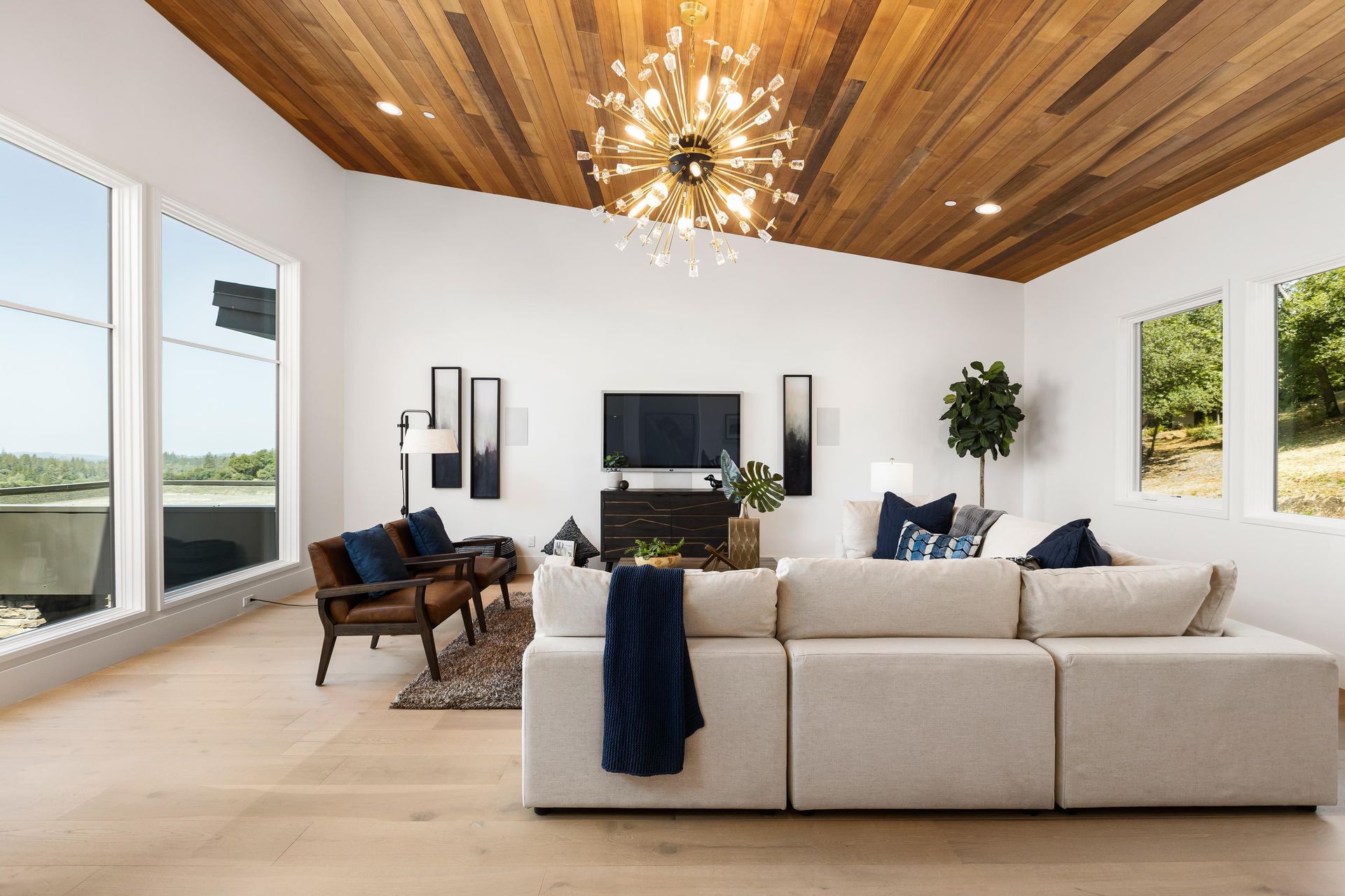 Every detail was meticulously selected for design and quality and blends perfectly together! When you enter through the focal iron and glass pivot door, you will pause to take in all the beauty of the spacious great room. The soaring raked wood ceilings and flooring add warmth while the walls of windows capture the view and bring in abundant natural light. The stunning designer chandeliers, modern linear fireplace, accent tile walls and the state-of-the-art kitchen are design elements that people dream about.