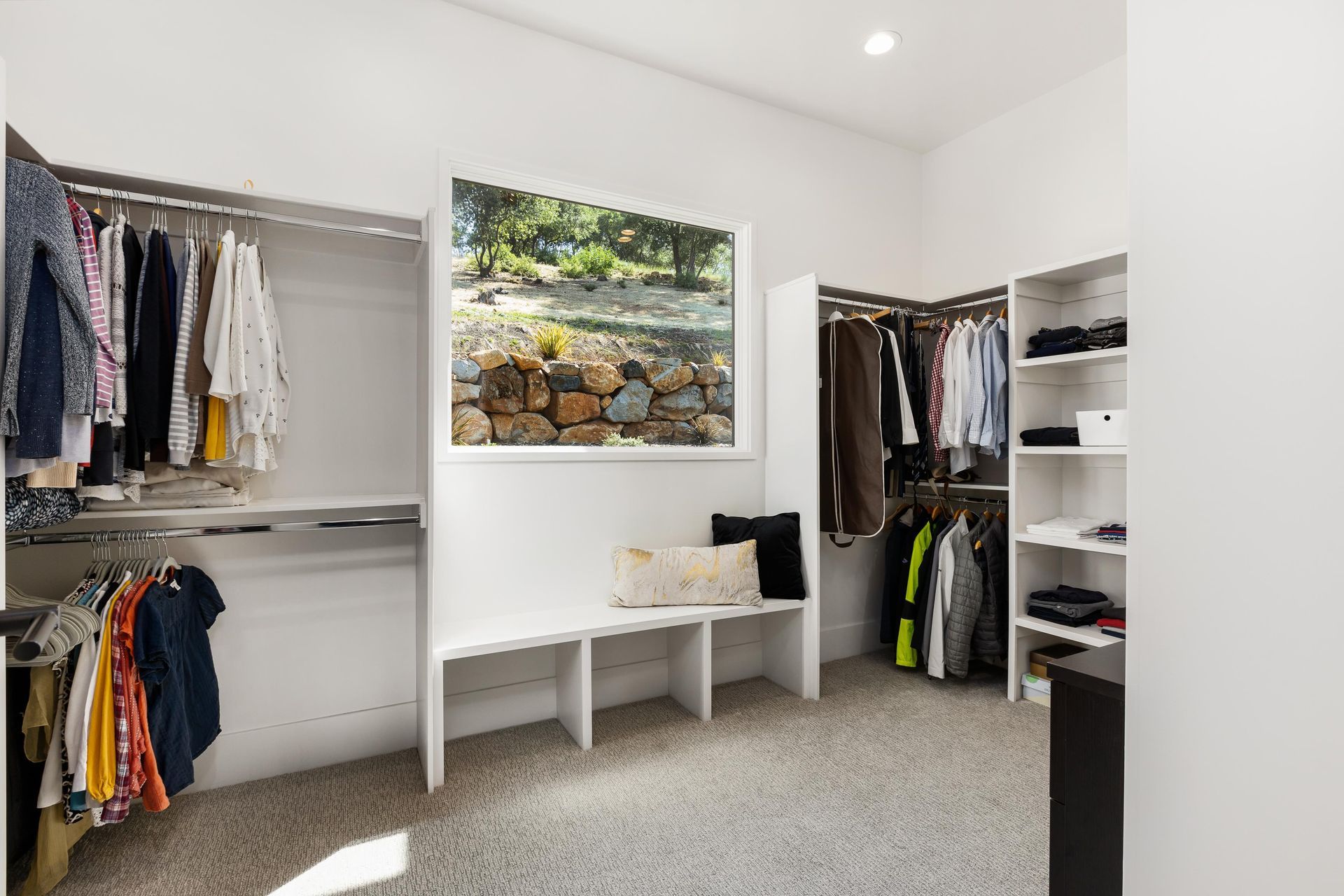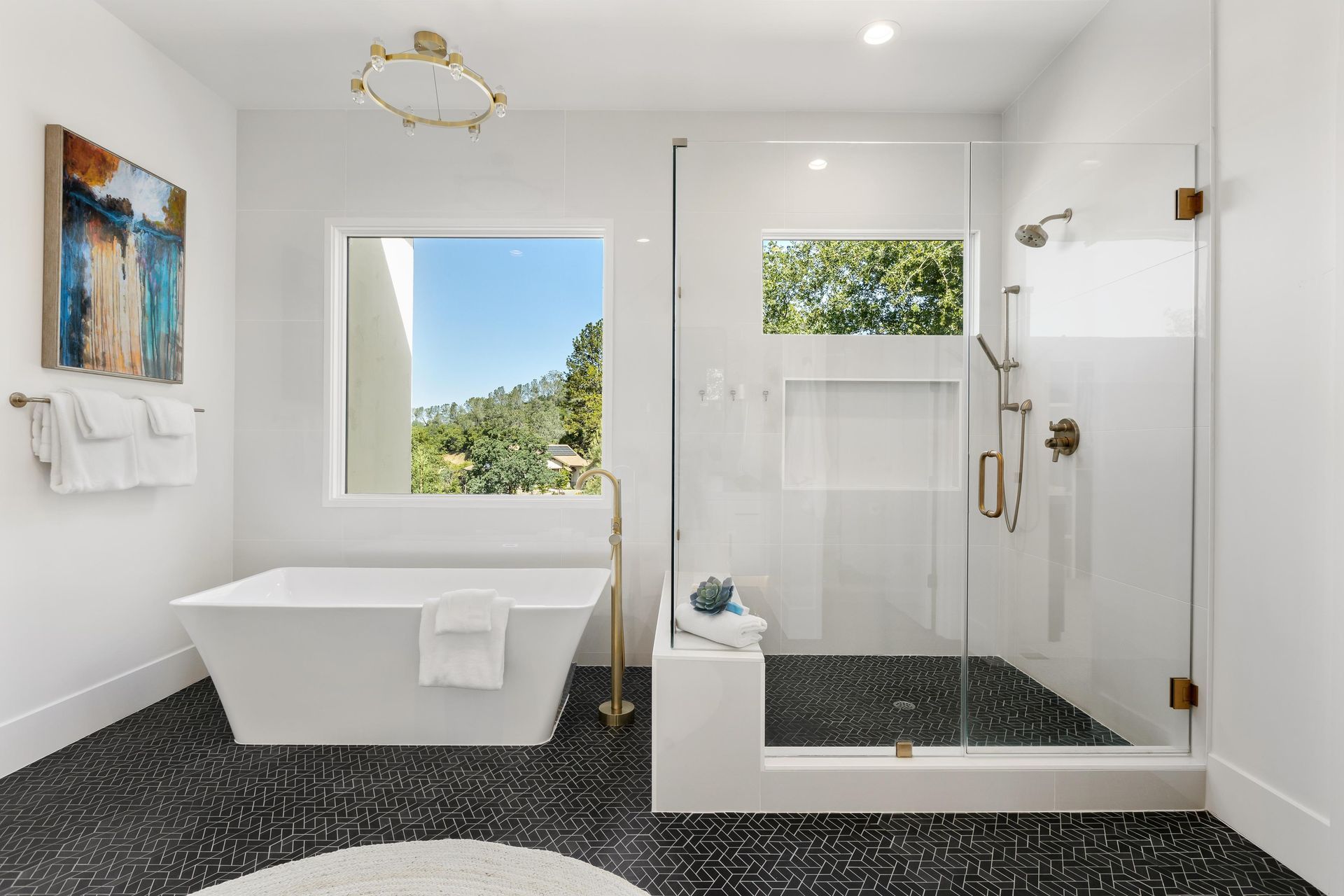The private master suite is truly a retreat! The generous master bedroom has large picture windows for the views, a linear fireplace and wood raked ceiling, plus a beautiful chandelier and pendants. The en suite bath boasts a large walk-in shower, romantic free standing soaking tub and a sizable vanity with 2 vessel sinks and make-up area, plus a large-walk-in closet.